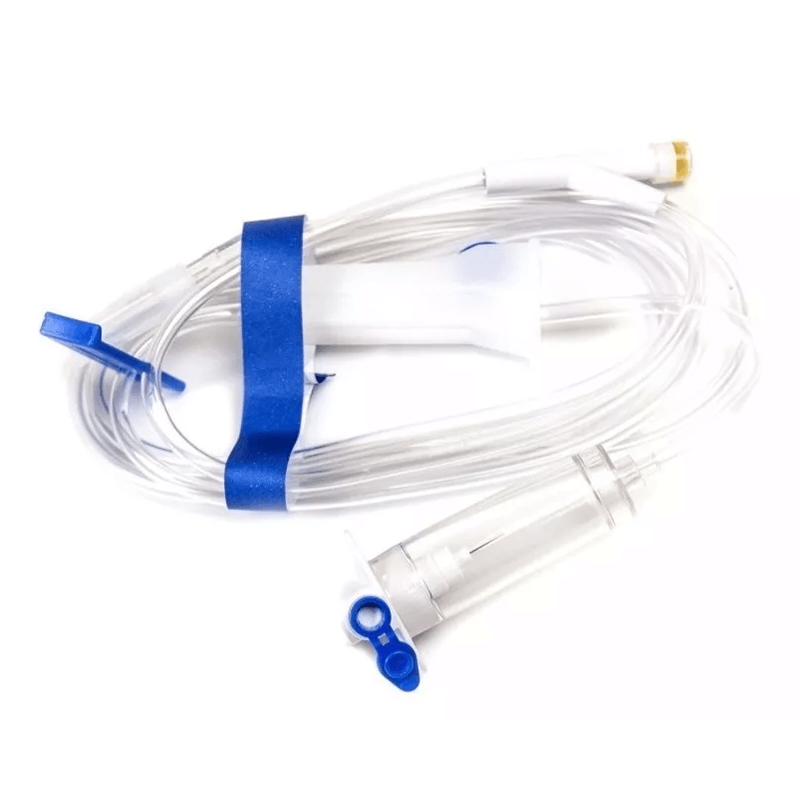 Equipo de infusión con cámara de 60 gotas/ml, para administración precisa de soluciones intravenosas.